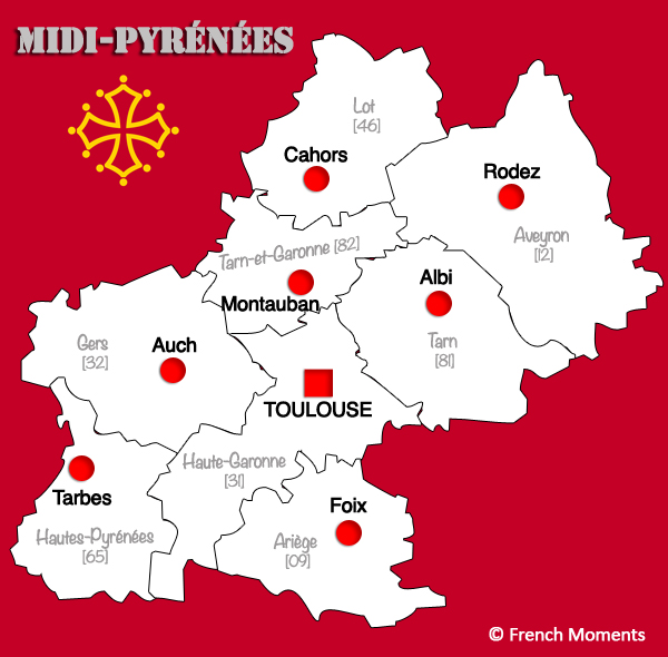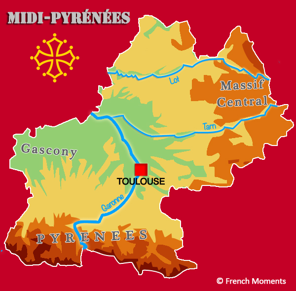 The Midi-Pyrénées region was created in 1956. Midi-Pyrénées is the largest region of metropolitan France (French Guyana being the largest overseas) with more than 45,000 square metres. Even larger than eight of the European Union states (Denmark, Switzerland, Netherlands…). But it is also one of the most sparsely populated areas in France, with approximately 2.9 million inhabitants. The region is made up of 8 départements: Aveyron, Ariège, Lot, Gers, Haute-Garonne, Hautes-Pyrénées, Tarn and Tarn-et-Garonne. Many rivers cross the region including the Garonne, the Tarn, the Aveyron or the Gers which give their names to departments. As a matter of fact, the historical flag of Languedoc, the Occitan cross, was adopted as the official flag of the Midi-Pyrénées region by the regional council. This historic flag design is itself derived from the coats of arms of the old county of Toulouse.