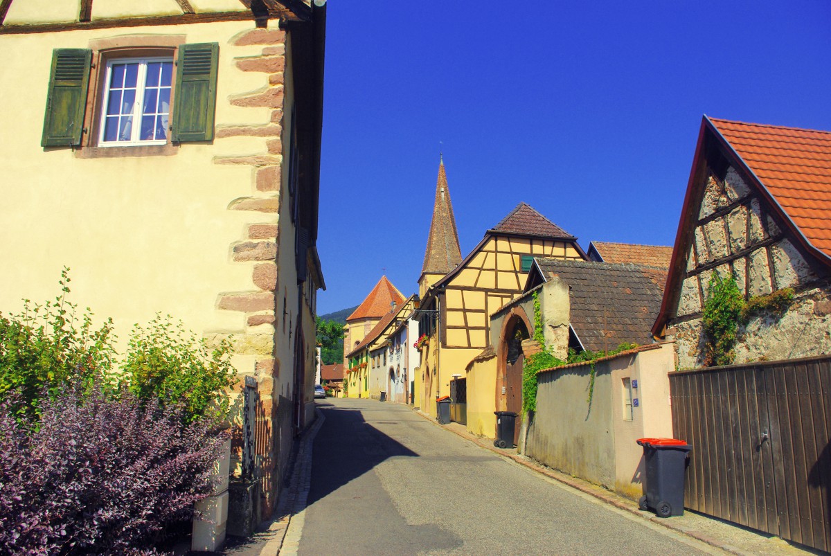 The charming wine village of Niedermorschwihr, Alsace is situated not far from Turckheim and Colmar on the Alsace Wine Route. It is reputed for its vineyards as well as for the unique crooked spire of its parish church.